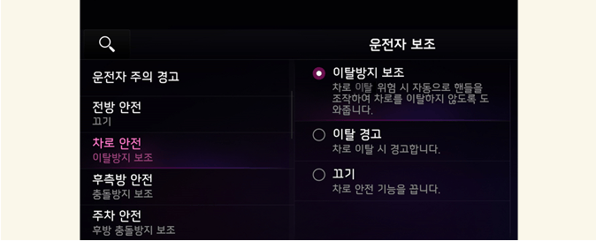 시동 'ON' 상태에서 인포테인먼트 시스템의 ‘설정 → 운전자 보조 → 차로 안전’을 차례로 선택하십시오. 각 기능의 사용 여부를 선택하실 수 있습니다.