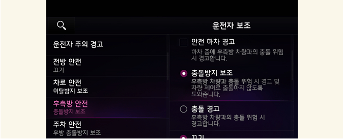 끄기를 선택하면 후측방 충돌방지 보조의 도움을 받을 수 없습니다. 항상 주의하여 운전하십시오.