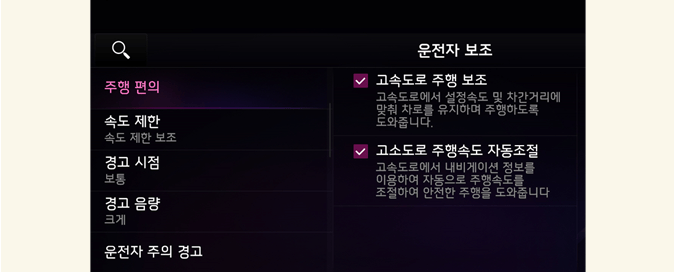 고속도로 주행 보조를 선택하면 전방 차량과의 거리와 설정속도를 유지하며 차로 중앙을 주행하도록 도와줍니다.