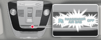 동승석에 성인 탑승 후「PASSENGER AIR BAG OFF」표시등이 켜져 있을 때 충돌 시 동승석 에어백이 팽창되지 않을 수 있습니다. 또한 어린이 보조 시트 설치 후「PASSENGER AIR BAG OFF」표시등이 꺼져 있을 때는 충돌 시 동승석 에어백이 작동하는 조건이 됩니다.