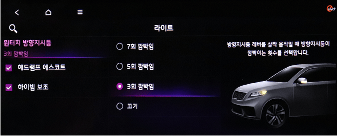 인포테인먼트 시스템에서 작동 횟수를 변경하거나 원터치 턴 램프 기능을 설정/해제할 수 있습니다.
