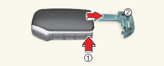 키 고정 버튼(1)을 누른 상태에서 비상키(2)를 잡아당겨 분리하십시오.