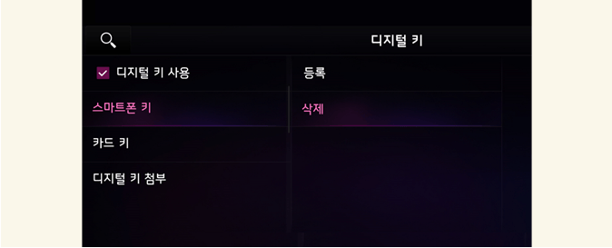 인포테인먼트 시스템 사양 미적용 시: 계기판 메뉴에서 '디지털 키→스마트폰 키' 하위 메뉴로 이동하여 '삭제'를 누르십시오.