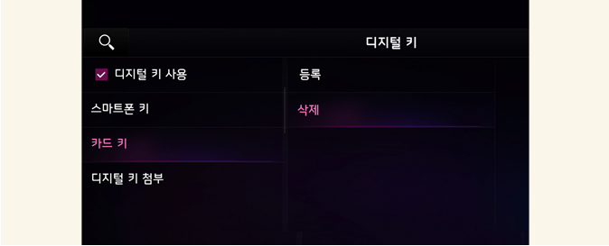 인포테인먼트 시스템 사양 미적용 시: 계기판 메뉴에서 '디지털 키→카드 키' 하위 메뉴로 이동하여 '삭제'를 누르십시오.