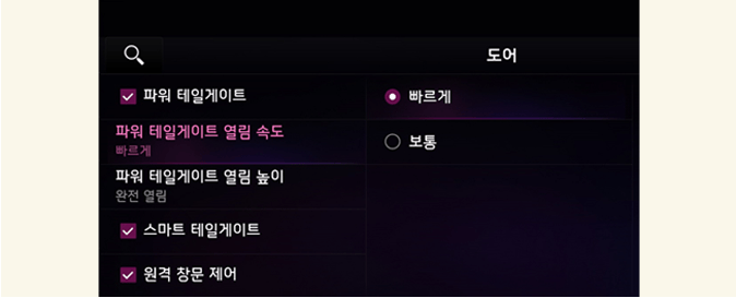 파워 테일게이트 초기 작동 속도는 '빠르게'로 설정되어 있습니다.