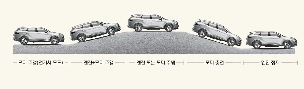 배터리 충전 상태에 따라 모터 및 엔진작동 상태가 변경될 수 있습니다.
