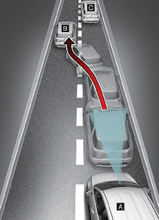 바로 앞에 있는 차량(B)이 옆 차로를 빠져 나갔을 때 같은 차로에 있는 앞 차량(C)을 인지하지 못하여 충돌 위험이 있을 수 있습니다. 항상 전방 도로 상황 및 주행 상태를 확인하고 주의하여 운전하십시오. 필요하면 브레이크 페달을 밟아 직접 속도를 조절하거나 스티어링 휠을 조작하십시오.