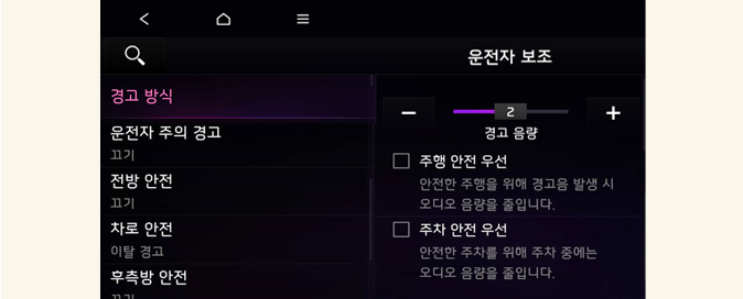 경고 방식을 변경하면 다른 운전자 보조 시스템의 경고 방식도 같이 변경될 수 있습니다. 고려하여 변경하십시오.