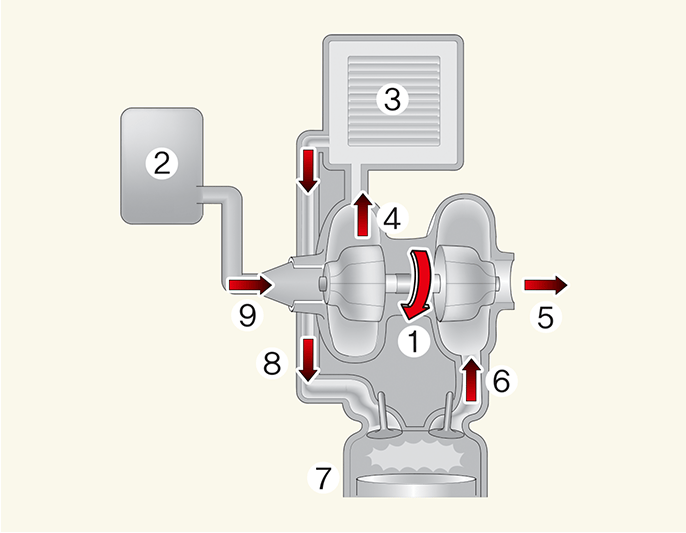 Intercooler(인터쿨러): 흡입된 고온의 공기를 냉각해 충진효율(실린더에 공급되는 흡기의 밀도)을 높이는 흡기 냉각 장치