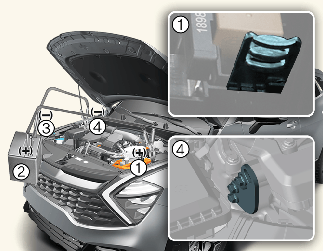 방전 엔진룸 퓨즈 박스 내부 충전 단자(1)와 보조 배터리 의 양극(+)(2)을 점프 케이블로 연결 하십시오.