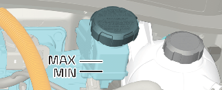 주기적으로 브레이크액 탱크의 액량이 「MIN」과 「MAX」 사이에 있는지 점검하십시오. 수준이 「MIN」 이하이면 자사 직영 서비스센터 또는 서비스협력사에서 점검을 받으십시오.