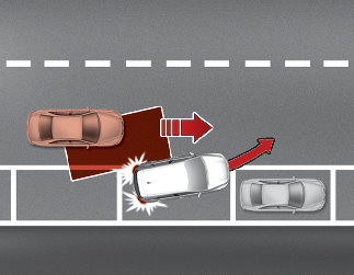 Når du kører fremad ud af en parkeringsplads, og Blind-spot kollisions-undgåelsesassistent bedømmer, at der er en kollisionsrisiko med et køretøj, der nærmer sig i blindvinklen, kan funktionen hjælpe med at undgå en kollision ved at anvende bremsen.
