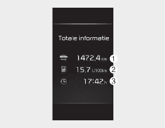Het display toont de geaccumuleerde ritafstand (1), het gemiddelde brandstofverbruik (2) en de totale rijtijd (3).