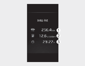 Het display toont de ritafstand (1), het gemiddelde brandstofverbruik (2) en de totale rijtijd (3) voor iedere cyclus tussen het in- en uitschakelen van de motor.
