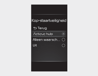 Als u kiest voor "Alleen waarschuwen", dan geeft het FCA alleen waarschuwingen en alarmen op grond van de kans op een botsing. U moet de rem zelf bedienen want het FCA heeft geen controle over de rem.