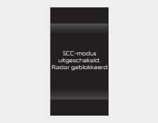 Als dit gebeurt, veschijnt de waarschuwingsmelding 'Smart Cruise Control disabled. Radar blocked obscured' ('Smart Cruise Control uitgeschakeld. Radar geblokkeerd) (of 'SCC (Smart Cruise Control) disabled. Radar blocked' ('Systeem veiligheid vooruit uitgeschakeld. Radar geblokkeerd') en gaan de waarschuwingslampjes branden op het instrumentenpaneel.