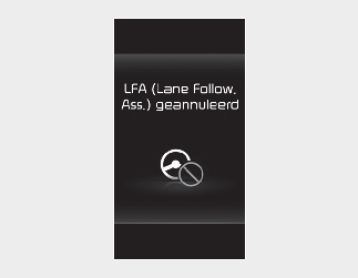 Indien de handen van de bestuurder nog steeds niet op het stuur zijn na de waarschuwing, verschijnt de waarschuwingsmelding 'Lane Following Assist (LFA) canceled’ ('Lane Following Assist (LFA) geannuleerd') en wordt Lane Following Assist automatisch geannuleerd.