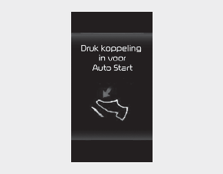 Als de motor is uitgezet of als de auto beweegt en er een versnelling wordt geselecteerd terwijl het koppelingspedaal niet wordt ingetrapt, laat het systeem de bovenstaande waarschuwingsmelding zien. Wanneer de bestuurder het koppelingspedaal nu helemaal intrapt, herstart de motor automatisch. (Alleen een ISG-systeem met Late Restart, behalve MHEV)