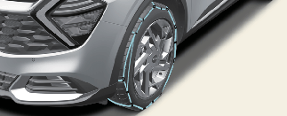 Röng keðjustærð eða rangt uppsettar keðjur geta skemmt hemlaleiðslur ökutækisins, fjöðrun, yfirbyggingu og hjól. Þar af leiðandi skaltu fylgja leiðbeiningum framleiðandans þegar þú setur á snjókeðjur og festa þær eins þétt og mögulegt er. Aktu hægt (innan við 30 km/klst.) með uppsettar keðjur.
