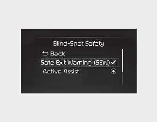 With the ENGINE START/STOP button in the ON position, select 'Driver Assistance → Blind-Spot Safety → Safe Exit Warning from the Settings menu to turn on Safe Exit Warning and deselect to turn off the function.