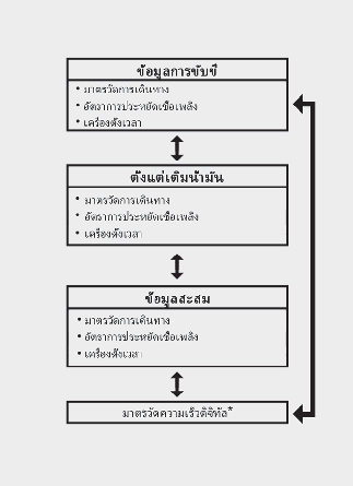 หน้าจอแสดงระยะทางการเดินทาง การใช้เชื้อเพลิงโดยเฉลี่ยอย่างมีประสิทธิภาพ และการใช้เชื้อเพลิงอย่างมีประสิทธิภาพแบบทันท่วงที (หรือ เวลาการขับขี่ทั้งหมด) ตั้งแต่เติมน้ำมัน