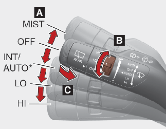 B: การปรับค่าเวลาการปัดน้ำฝนแบบไม่ต่อเนื่อง/การปรับค่าเวลาการปัดน้ำฝนควบคุมอัตโนมัติ*