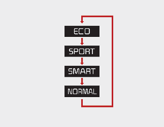 โหมดขับขี่จะเปลี่ยนเป็นโหมด NORMAL เมื่อสตาร์ทเครื่องยนต์ใหม่ อย่างไรก็ตาม ยกเว้นเมื่ออยู่ในโหมด ECO และโหมด SMART โหมด ECO และโหมด SMART จะยังคงอยู่ตามที่เลือกไว้เมื่อสตาร์ทเครื่องยนต์ใหม่