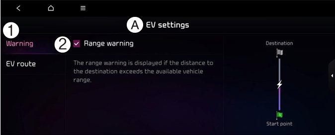 您可以使用電動車相關功能以引導路線。其可讓您檢查以目前電量可前往的距離。畫面會顯示前往目的地途中可通行和不可通行的路段。搜尋充電站圖示也會顯示,所以可讓您立即尋找附近的充電站。