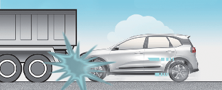 緊急煞車會降低車輛前部,導致車輛前部「重疊」在某個離地間隙較高的車輛底部。 安全氣囊在這種「底部重疊」情況中不展開,因為「底部重疊」碰撞會顯著降低感測器檢測到的減速力。 |