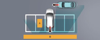如果車輛向後停放且感測器偵測到停車位後方區域的另一輛車,功能即會發出警告或控制煞車。務必在駕駛時注意停車空間。
