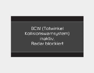 In diesem Fall wird die Warnmeldung „Blind-Spot Safety system disabled. Radar blocked (Totwinkel-Sicherheitsfunktion deaktiviert. Radar blockiert)“ auf dem Kombiinstrument angezeigt.