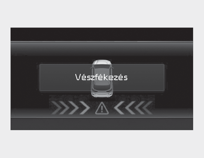 A Hátsó keresztforgalmi ütközés elkerülése segéd figyelmeztet és az ütközésveszély szintjétől függően irányítja a járművet: „Ütközési figyelmeztetés“, „Vészfékezés“ és „A jármű megállítása é s a fékvezérlés befejezése“.