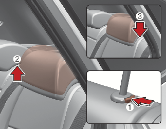 To lower the headrest, push and hold the release button (2) on the headrest support and lower the headrest to the desired position (3).