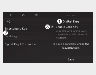 When there is a digital key (card key) already saved in the vehicle, the 'Save' menu is disabled. If you want to save a digital key again, refer to More Details and follow the deleting procedure first before saving a digital key.