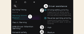Når bilen er tændt, vælges Indstillinger → Bil → Førerassistent → Kørselssikkerhed → Advarselsvolumen i infotainmentsystemet for at ændre Advarselsvolumen og justere volumenniveauerne til Høj, Medium, Lav eller Fra.