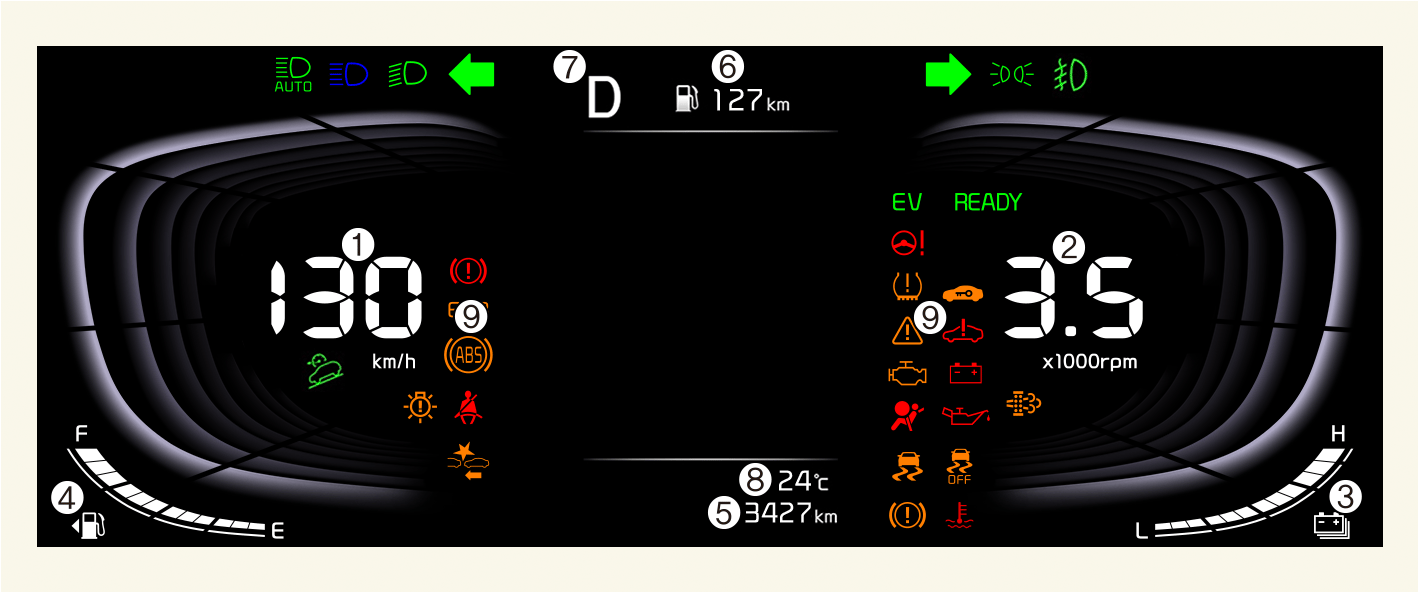 ECO: Shows that the vehicle is being driven in an Eco-friendly manner.