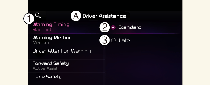 Standard: Use in a normal driving environment. If the function operates too sensitively, set to the warning timing to Late.