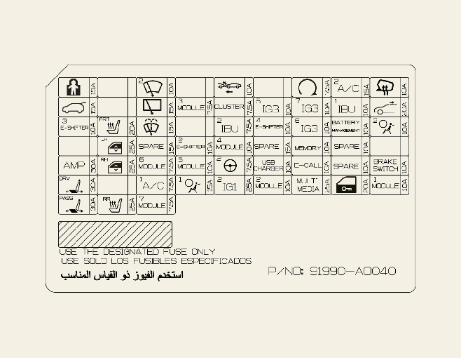 (FUSE -MODULE2, USB CHARGER, A/BAG1, IBU2, MDPS2, CLUSTER, MODULE3, A/BAG IND, MODULE4, MODULE5, E-SHIFTER2, FCA, ING1 2) |
