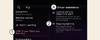 Med køretøjet tændt skal du vælge Indstillinger → Førerassistentsystem → DAW (Advarsel om føreruopmærksomhed) på instrumentklyngen eller Indstillinger → Køretøj → Førerassistentsystem → DAW (Advarsel om føreruopmærksomhed) i infotainmentsystemet.