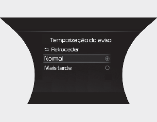 O condutor pode selecionar o tempo de ativação inicial do aviso nas definições de utilizador, no ecrã LCD, selecionando "User Settings (LCD display) (Definições de utilizador (Ecrã LCD)) ou Settings (Definições) Vehicle (Infotainment System screen) (Veículo (Ecrã do sistema de infotainment)) Driver Assistance (Assistência ao condutor) Warning Timing (Temporização do aviso)". Quando o veículo é entregue inicialmente, Warning Timing (Temporização do aviso) está definido como Normal. Se alterar a temporização do aviso, o tempo de aviso de outras funções de assistência ao condutor poderá mudar. Verifique a temporização do aviso antes de a alterar.