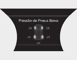 Quando as luzes de aviso do sistema de monitorização da pressão dos pneus acenderem e a mensagem de aviso for exibida no ecrã LCD do painel, isso significa que um ou mais pneus têm pressão insuficiente.
