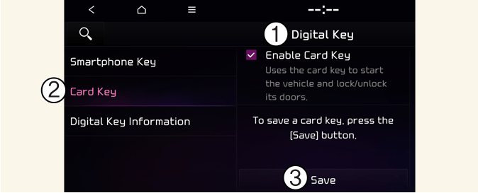 When there is a digital key (card key) already saved in the vehicle, the Save menu is disabled. If you want to save a digital key again, refer to More Details and follow the deleting procedure first before saving a digital key.