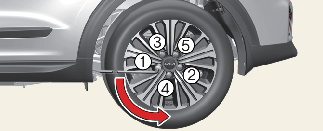 השתמש במפתח האומים של חישוקי הגלגלים כדי להדק את אומי הגלגלים. ודא שגביע המפתח מכסה את האום לחלוטין. הדק את האומים לפי סדר המספרים באיור עד שכל האומים יהיו מהודקות כהלכה. חזור ובדוק היטב את ההידוק של כל אום.