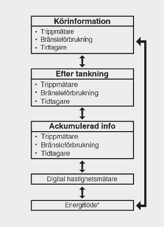 Denna display visar färdsträckan (1), genomsnittlig bränsleförbrukning (2) och den aktuella bränsleförbrukningen (3) samt total körtid (4). Informationen uppdateras en gång per en tändcykel.