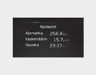 Tämä näyttö näyttää kertyneen osamatkaetäisyyden, keskimääräisen polttoainekulutuksen ja kokonaisajoajan.