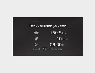 Tässä näytössä näytetään osamatka, keskimääräinen polttoainekulutus ja hetkellinen polttoainekulutus (tai kokonaisajoaika) tankkaamisen jälkeen.