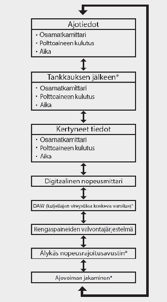 Keskimääräinen polttoainetalous lasketaan kokonaisajomatkasta ja polttoaineenkulutuksesta viimeisimmän keskimääräisen polttoainetalouden nollauksen jälkeen.