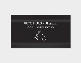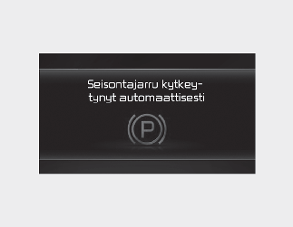 Näissä tapauksissa jarrun varoitusvalo syttyy, AUTO HOLD -merkkivalo vaihtuu vihreästä valkoiseksi, ja annetaan varoitusääni ja viesti ilmoittamaan, että EPB on kytketty automaattisesti. Ennen liikkeelle lähtemistä on painettava jalkajarrupoljinta, ympäristö auton lähellä on tarkistettava ja seisontajarru on vapautettava käsin EPB-kytkimellä.