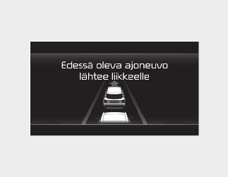 Kun edessä oleva ajoneuvo lähtee liikkeelle, liikkeellelähtöilmoitus ilmoittaa asiasta kuljettajalle mittaristossa viestillä ”Leading vehicle is driving away” (Edessä oleva ajoneuvo lähtee liikkeelle) (tai ”Leading vehicle is driving on” (Edessä oleva ajoneuvo jatkaa matkaa)) ja äänivaroitus soi.