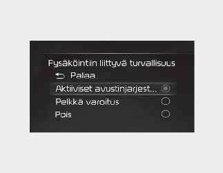 Kun MOOTTORIN KÄYNNISTYS/PYSÄYTYS -painike on ON-asennossa, voit kytkeä kunkin toiminnon päälle tai pois päältä valitsemalla asetusvalikossa ”Driver Assistance (Kuljettajan avustus) → Parking Safety (Pysäköintiturvallisuus)" tai perumalla valinnan.